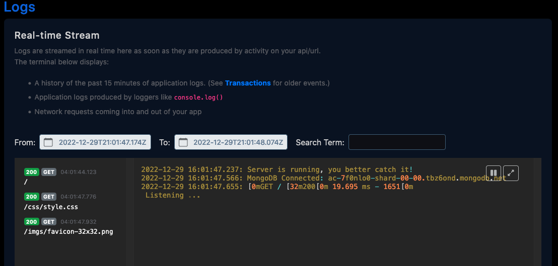 Once you’ve updated your MongoClient code, you should be seeing all 200s in the logs.