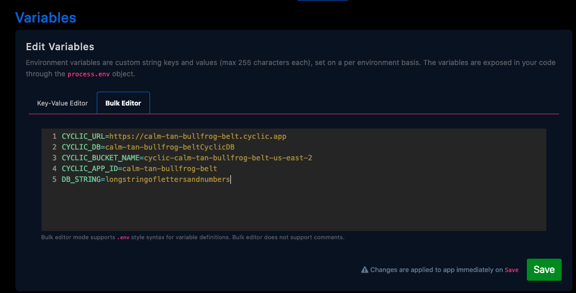 Remember the key should match the key in your code, and if you want to copy/paste from your .env file, be sure to try out the bulk editor tab.