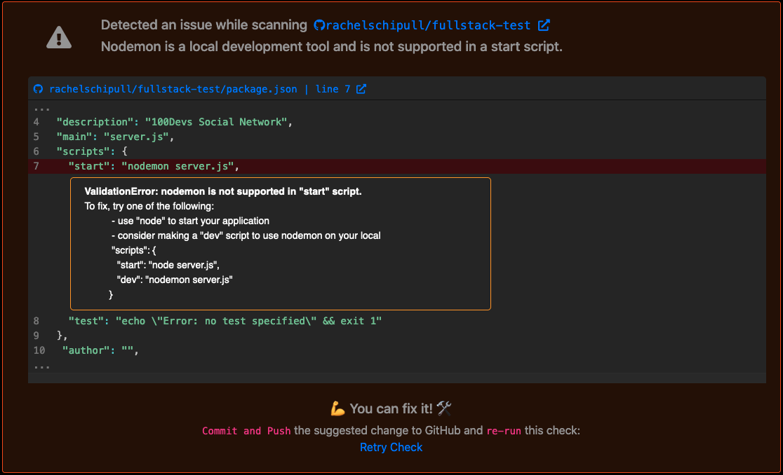 Luckily for you, Cyclic will scan your repository before the build starts and provide you with a message to this effect. Look at that! Cyclic tells you exactly what to do.