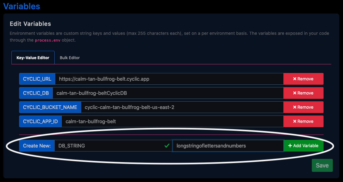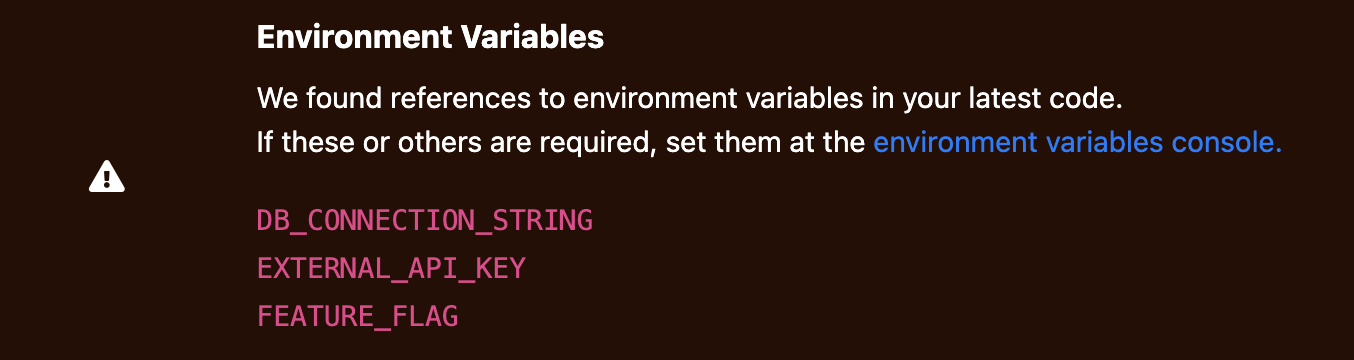Sometimes users get caught up in the excitement of completing a build and forget to add their environment variables to Cyclic. Cyclic can see the variables you've used in your project and will give you a little push to add them the moment your build is complete.