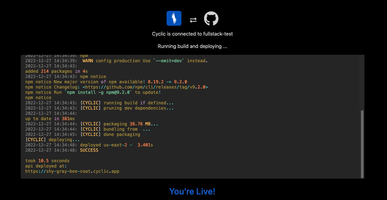 You gather your Github and your Node.js full stack app and head over to Cyclic.sh. You sign in with Github and you are ready to hit deploy.