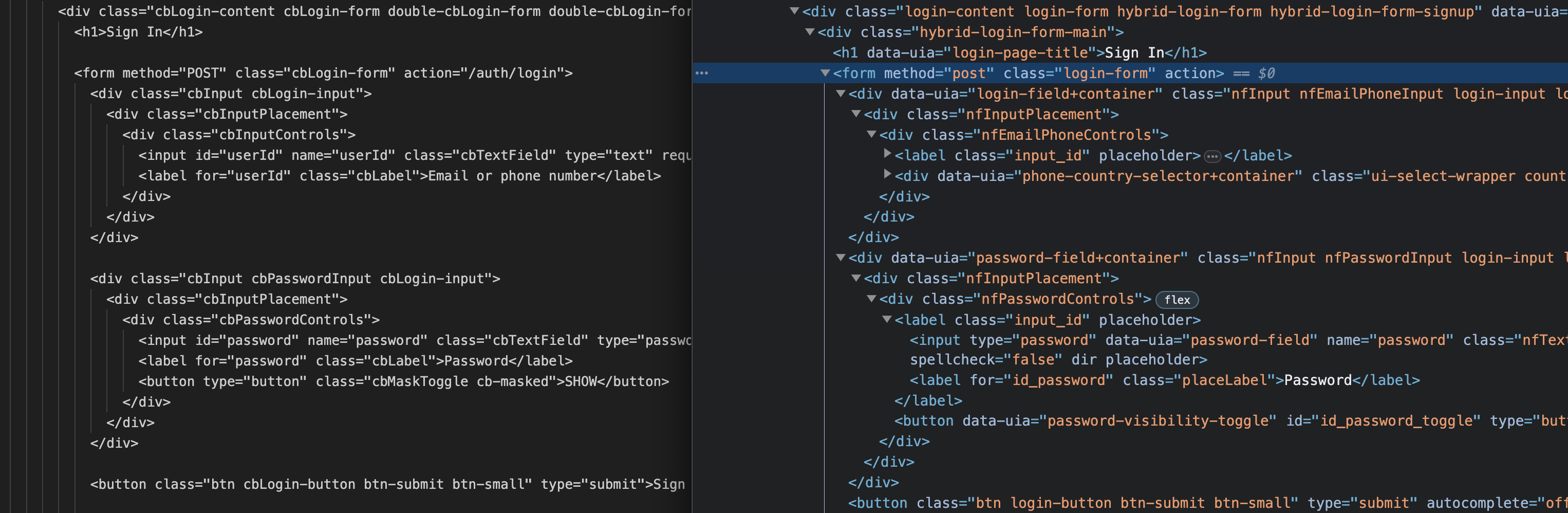 All the links to the Privacy Policy, Help Center and TOS still work and point to the real targets. The big difference is the form post on the scam page points to /auth/login.